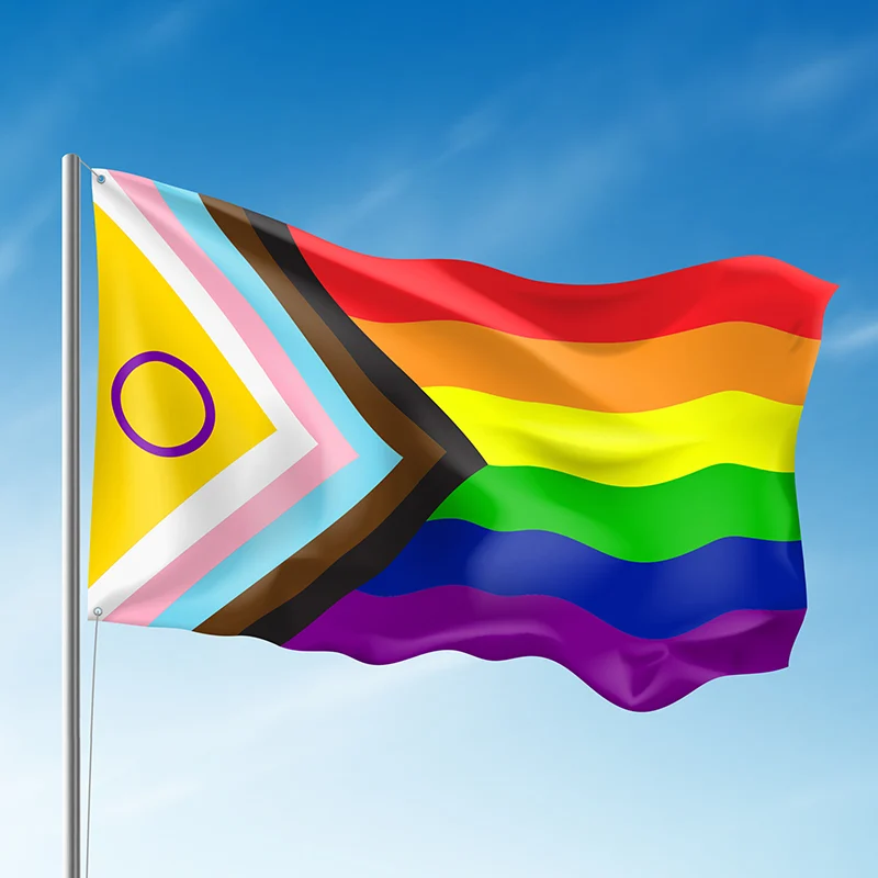 a woman hugs a young man on a couch - a pride flag hangs in the background